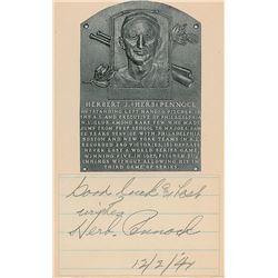 Vintage pencil signature, "Good luck and best wishes, Herb Pennock, 12/2/41” on an off-white 3.5 x 2.25 card, affixed to a larger card below a ...
