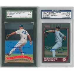 Two baseball cards signed in blue felt tip by New York Yankees closer Mariano Rivera, who adds his number, "42," to both cards, and his ni...