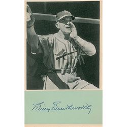 Vintage fountain pen signature, "Billy Southworth,” on a light green 3.75 x 1.5 slip, affixed to a larger card bearing an affixed portrait of t...