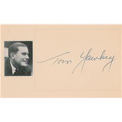Vintage ballpoint signature, "Tom Yawkey,” on an off-white 4 x 3 card, affixed to a slightly larger card beside a portrait of the Red Sox owner...