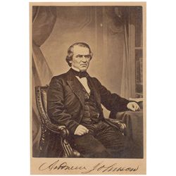 Rare 4.25 x 6.25 cabinet photo showing Johnson in a three-quarter-length seated pose, boldly signed in the lower border in black ink. Trimmed edges wi