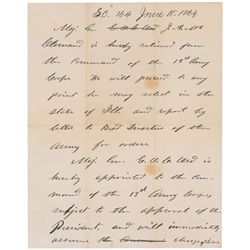 Civil War–dated document handwritten by Grant but unsigned, one page, 7.5 x 9.5, June 18, 1863. Special Order 164 relieving Major General McClernand o