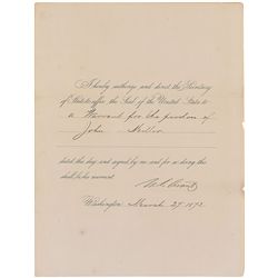 Partly-printed DS as president, one page, 8.5 x 11, March 27, 1872. President Grant orders the secretary of state to “affix the Seal of the United Sta