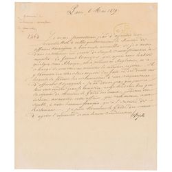 LS in French, signed “Lafayette,” one page, 7.25 x 8.5, May 6, 1829. An intriguing letter regarding an exiled friend. In part (translated): “I would n