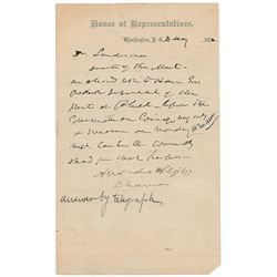 ALS signed “Alexander H. Stephens, Chairman,” one page, lightly-lined, 4.75 x 8, House of Representatives letterhead, May 2, 1878. Letter to Dr. Henry