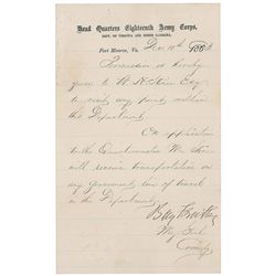Two items: war-dated LS signed “Benj. F. Butler,” one page, 5 x 8, Head Quarters Eighteenth Army Corps letterhead, December 10, 1863, in part: “Permis