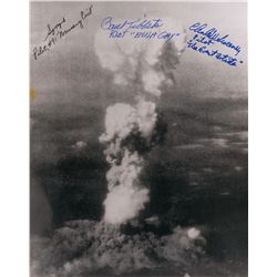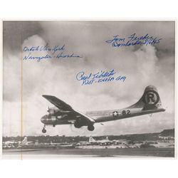 Glossy 8 x 10 photo, signed in blue and black felt tip by Paul Tibbets, George Marquardt, and Charles W. Sweeney, each adding his plane and flight ass