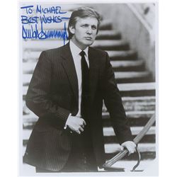 Glossy 8 x 10 three-quarter length photo of Trump leaning on a railing, signed and inscribed in blue felt tip, “To Michael, Best Wishes—Donald J. Trum