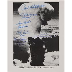 Uncommon 8 x 10 cardstock photo of the Hiroshima explosion, signed in ink by Paul Tibbetts, Dutch Van Kirk, Tom Ferebee, Dick Nelson, Morris Jeppson,