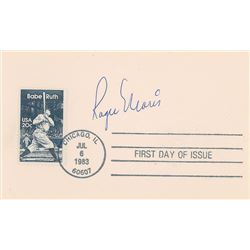 Ballpoint signature, “Roger Maris,” on an off-white 5 x 3 card bearing an affixed Babe Ruth postage stamp with first day cancelation. In fine conditio
