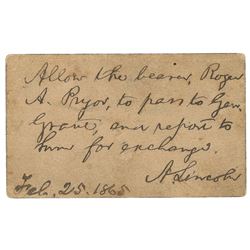 ANS signed “A. Lincoln,” one page, 3.25 x 2, February 25, 1865. In full: “Allow the bearer, Roger A. Pryor, to pass to Gen. Grant, and report to him f