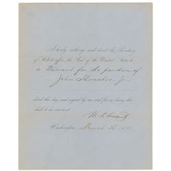 Partly-printed DS as president, one page, 8 x 10, March 26, 1870. President Grant directs the “Secretary of State to affix the Seal of the United Stat