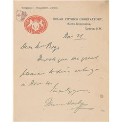 English scientist and astronomer (1836–1920) credited with Pierre Janssen as the co-discoverer of helium. Uncommon ALS, one page, 4.5 x 5.75, Solar Ph