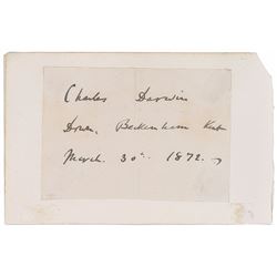 Bold ink signature, “Charles Darwin, Down, Beckenham, Kent, March 30, 1872,” on an off-white 5 x 3.5 slip. Affixed to a larger album page and in fine