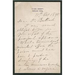 ALS, one page both sides, 4 x 6, black-bordered 12 Park Crescent letterhead, October 11, 1895. Letter to Dr. William Bulloch, in full: “I am much obli