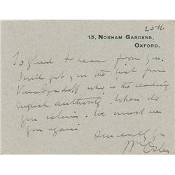 Canadian-born physician and researcher (1849–1919) who was a founding professor of Johns Hopkins Hospital. ANS signed “Wm. Osler,” one page, 4.5 x 3.5