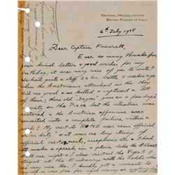 World War I-dated ALS signed “Edward,” one page both sides, 6.5 x 8, General Headquarters, British Forces in Italy letterhead, July 4, 1918. Letter to