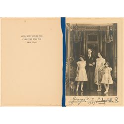 Circa 1947 royal Christmas card with an embossed golden crown on the front, measures 13.75 x 5.75 open, bearing a wonderful family portrait of King Ge