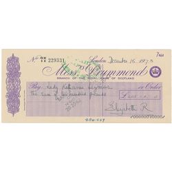 Drummonds Bank check, 8 x 3.5, filled out and signed by the Queen Mother, “Elizabeth R.,” payable to Lady Katharine Seymour for £200, December ...