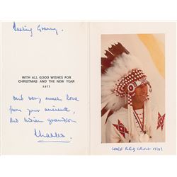 Christmas and New year card from 1977, measures 9.5 x 7.25 open, featuring an affixed color photo of Charles wearing a Native American headdress, face
