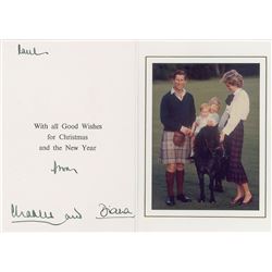Royal Christmas card from 1992, measuring 16 x 6 open, featuring an affixed color photo of Charles posing with his sons William and Henry, signed and