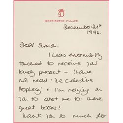 ALS signed “Diana X,” one page both sides, 6.25 x 8, Kensington Palace stationery, December 21, 1996. Letter to Simon Barnes, in full: “I was enormous