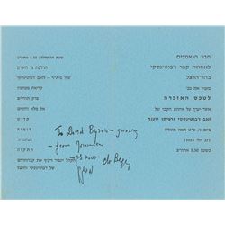 Booklet in Hebrew for the 1976 Memorial of author Ze'ev Jabotinsky, measures 7.75 x 6 open, signed and inscribed inside and upside down in black...