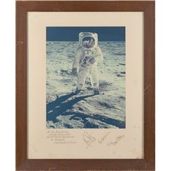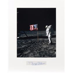 Oversized color semi–glossy 10.5 x 13.5 full-length photo of Buzz Aldrin on the lunar surface, mounted to the original 15.5 x 19.5 presentation mat, i