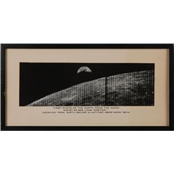 Incredible glossy 13.25 x 4.25 photo of the Earth with the lunar surface below, affixed to a 16.25 x 7.75 display mount bearing preprinted text, “Firs