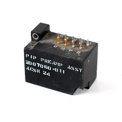 Small black electronic component with nine pins on one side, 1.5 x 1.25 x 1, stenciled with white text, “PIP Preamp Assy, 2004060-011, ACSK 24.” In fi