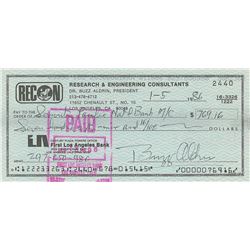 RECON business check, 6 x 2.75, filled out and signed by Aldrin, payable to Security Pacific National Bank for $769.16, January 5, 1986. In fine condi