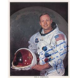 Official color 8 x 10 NASA lithograph of Armstrong posing in his white space suit against a lunar backdrop, signed and inscribed in blue felt tip, “To