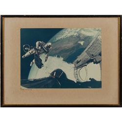 Official color 8 x 10 NASA lithograph of White posing beside a rocket model in his space suit, signed and inscribed in black felt tip, “To William San
