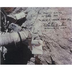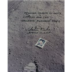 Two photos: a color semi-glossy 10 x 8 photo of Duke walking near a crater on the lunar surface, signed in blue felt tip, “Soil sampling at Plum crate