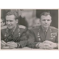 Vintage glossy 5 x 3.5 photo of Yuri Gagarin and Gherman Titov side-by-side, signed in fountain pen by both. In fine condition.