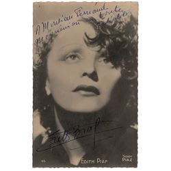 Vintage matte-finish 3.5 x 5.5 deckle-edge postcard photo of Piaf by Teddy Piaz, signed and inscribed in fountain pen in French. In fine condition, wi
