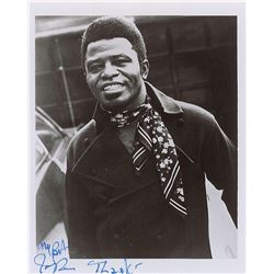 Glossy 8 x 10 photo of Brown from early in his career, signed in blue felt tip, "My best, James Brown, Thanks." In very fine condition.