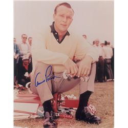 Color glossy 11 x 14 photo of a young Arnold Palmer sitting on his golf bag, signed in blue felt tip. In fine condition.