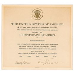 DS as president, one page, 11 x 10.25, March 1, 1948. Certificate of Merit presented to Henri Gaston Busignes “for outstanding fidelity and meritoriou