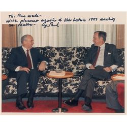 Color glossy 9.75 x 8 photo of Soviet General Secretary Mikhail Gorbachev and President Bush conversing aboard the cruise liner Maksim Gorkiy during t
