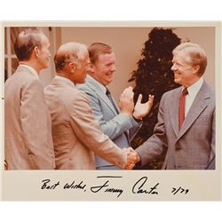 Color satin-finish 10 x 8.25 photo of President Carter greeting the astronauts of Apollo 11, signed in the lower border in black felt tip, "Bes...