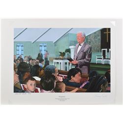 Color limited edition 24 x 18.75 print of a 2012 Charles Funk painting entitled 'Hospitality,' showing President Carter at the Maranatha Bap...