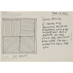 Desirable sketch and handwritten note on the reverse of a 6 x 4 postcard depicting one of LeWitt's open cube installations, February 14, 1995, i...