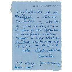 Swiss-born French Art Nouveau painter and printmaker (1859-1923). ALS in French, signed “Steinlen,” one page, 4.75 x 6.5, personal letterhead, postmar