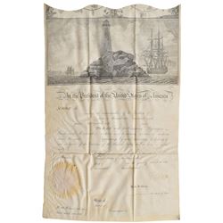 Self-contained partial partly-printed vellum DS as president, one page, 11.75 x 9.5, March 8, 1798. The lower half of a scallop-topped ship’s pass, pe