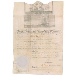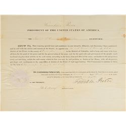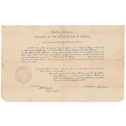 Unusual and impressive illuminated partly-printed DS as president, one page, 17.75 x 14, March 21, 1866. President Johnson appoints W. Martin Jones of