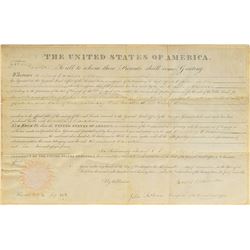 Partly-printed vellum DS as president, one page, 11.75 x 15, June 24, 1844. Scallop-topped ship’s pass issued to “the Ship Huntress, Edward T. Shearma