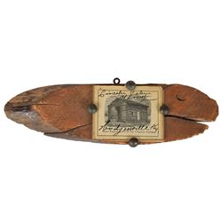 Piece of wood recovered from the birthplace of Abraham Lincoln, measuring 9.5 x 2.5 x .5, with printed reproduction of Lincoln's original log ca...