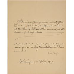 Partly-printed DS as president, signed “R. B. Hayes,” one page, 7.75 x 10, April 15, 1878. President Hayes directs the "Secretary of State to a...