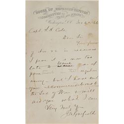 ALS signed “J. A. Garfield,” one page, 5 x 8, House of Representatives, Committee of Ways and Means letterhead, December 4, 1866. Letter to Capt. S. H